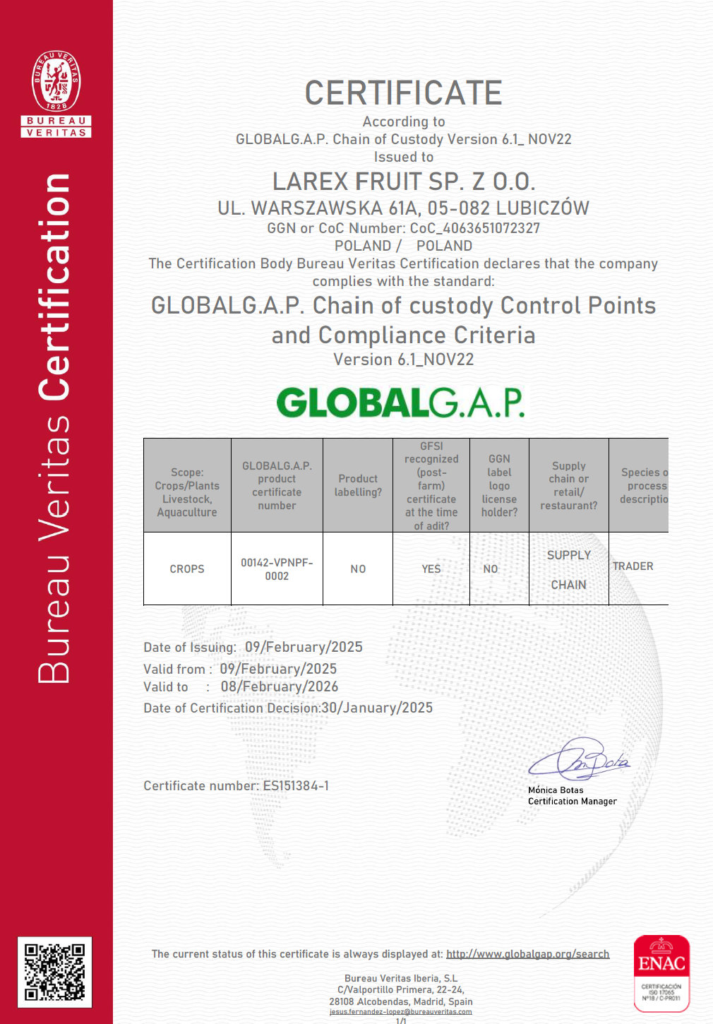 We are certified with IFS Broker and GLOBALG.A.P. Chain of Custody