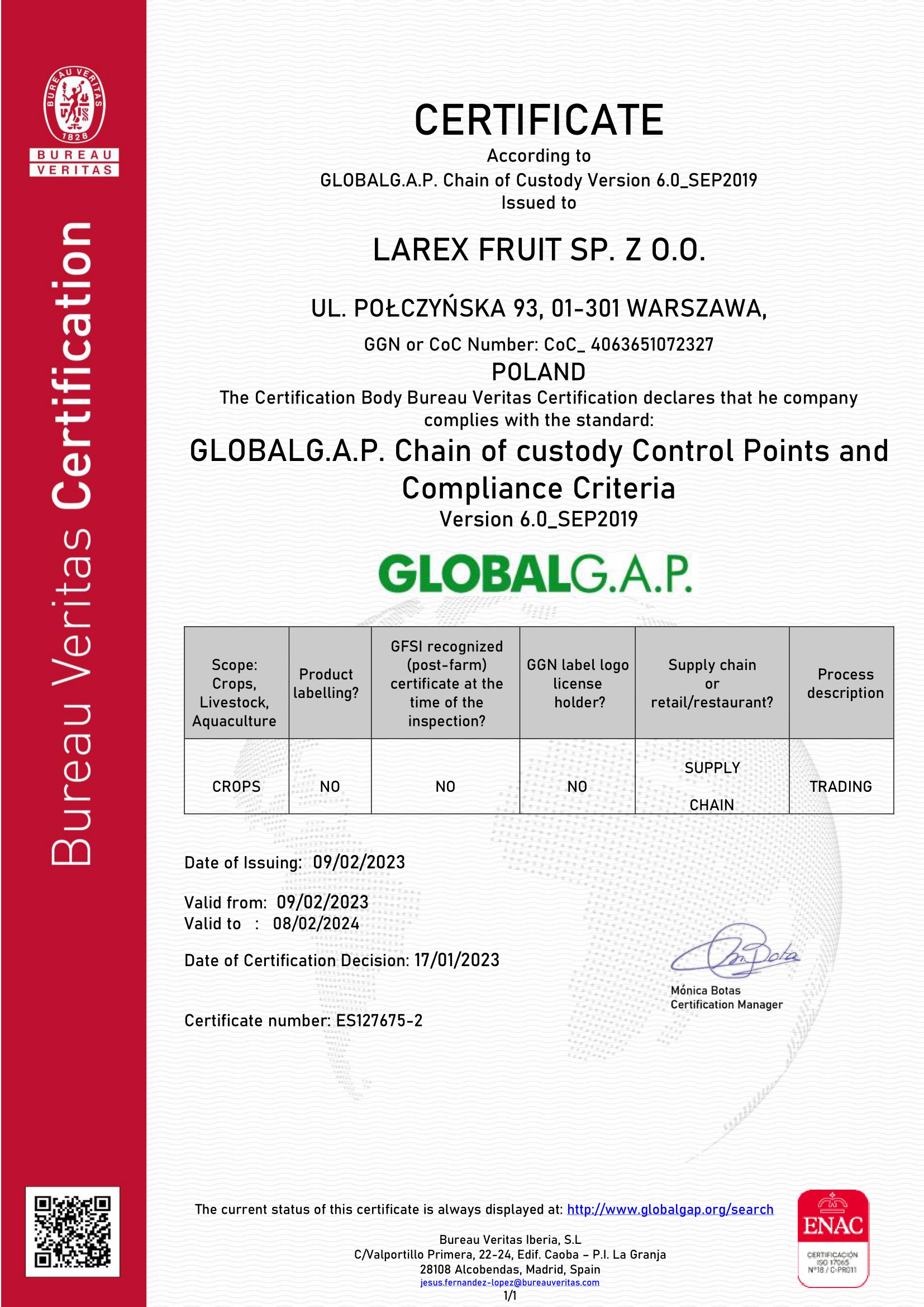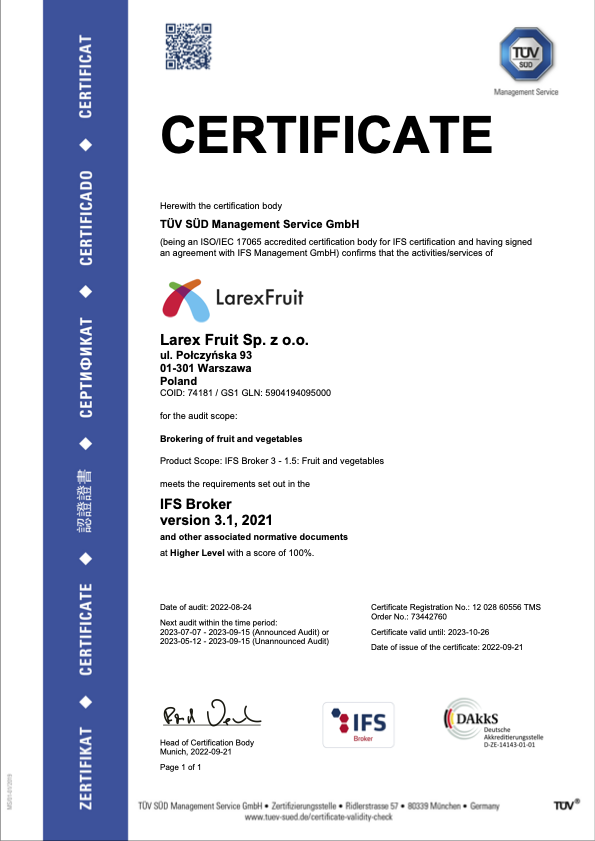 We are certified with IFS Broker and GLOBALG.A.P. Chain of Custody